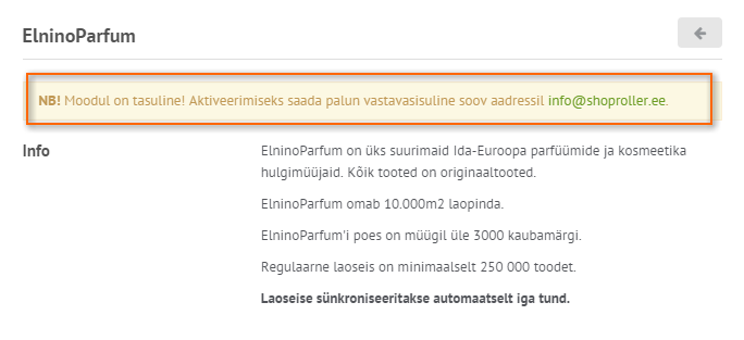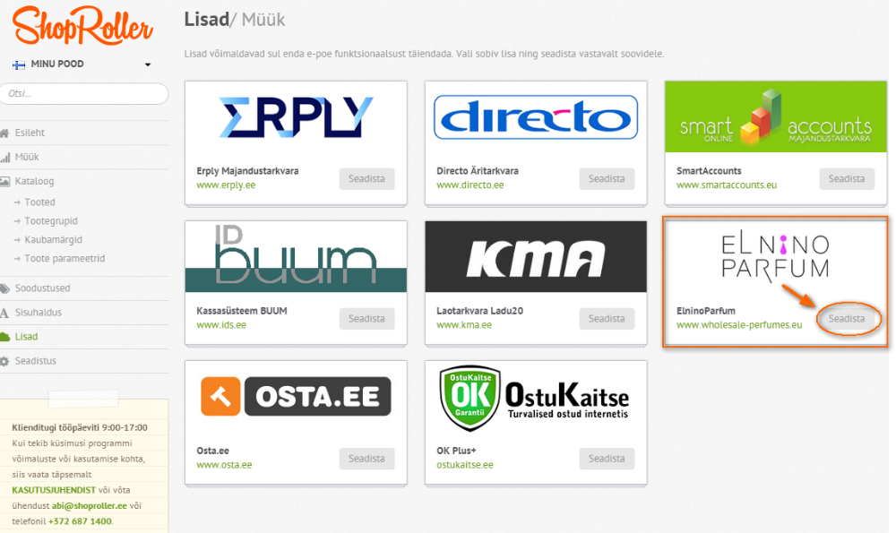 1. Elnino Parfumi seadistamiseks klikka ikoonil Seadista! Sünkroniseerimiseautomaatseks käivitamiseks saada palun vastavasisuline soov aadressil info@shoproller.ee!