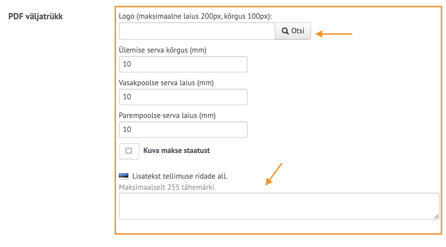 Avanenud pdf seadistamise lehel: lisa pdf väljatrükile logo, määra kas soovid näidata maksestaatust ning vajadusel lisa pdfile lisatekst. Salvesta muudatused!