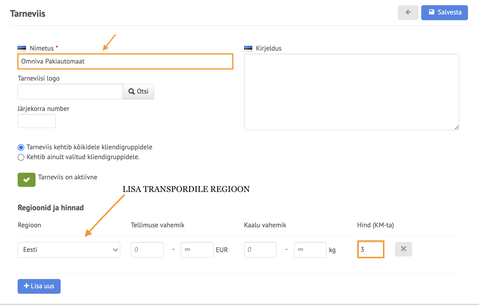 - Lisa regioon ja hinnad transpordile ning tee muud seadistused.