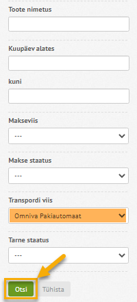 - Selleks kasuta paremas ääres olevat Otsingufiltrit, et otsida üles Omniva pakiautomaadi tarneviisiga tellimused